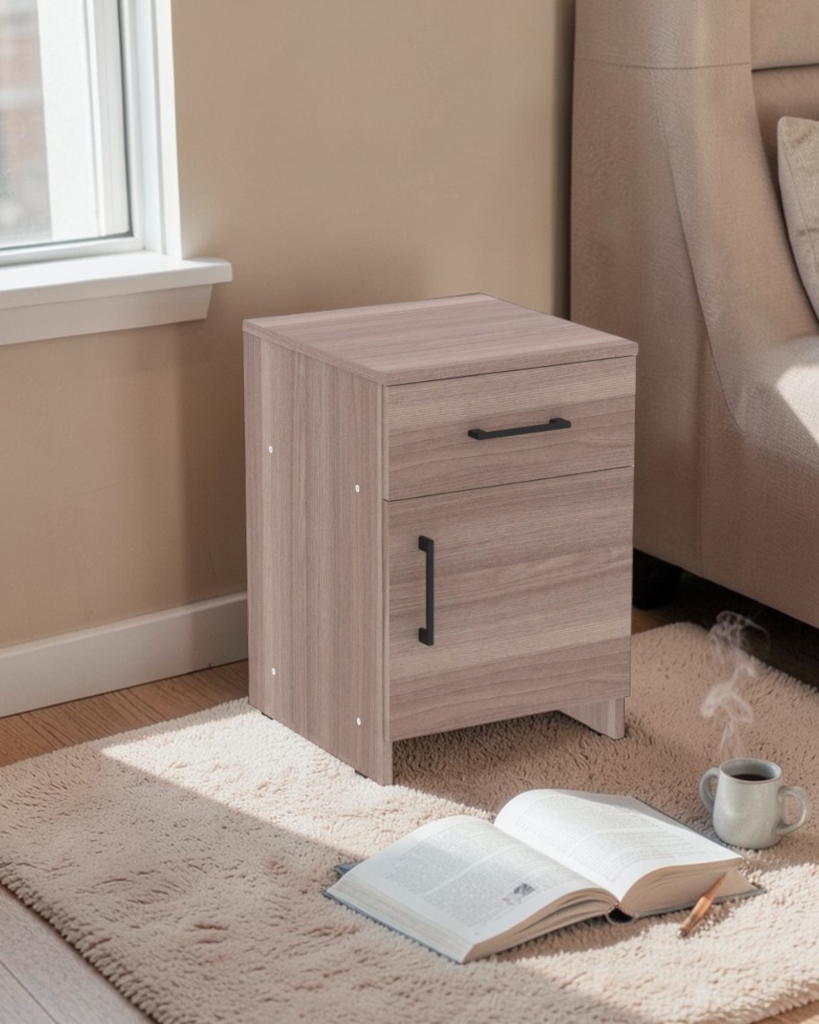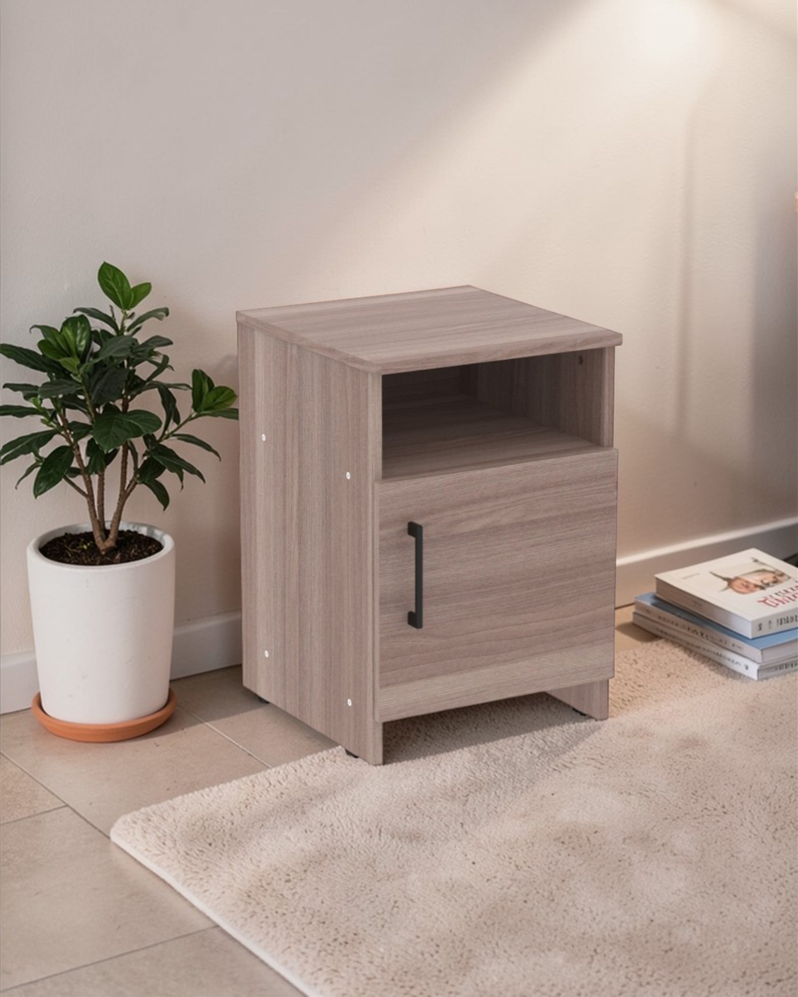 Тумба прикроватная с 2 полками и выдвижным ящиком, изготовлена из ЛДСП 16 мм, кромка 0,4 мм.Размер 400х420х580 мм.Есть возможность установки двери на разные стороны.